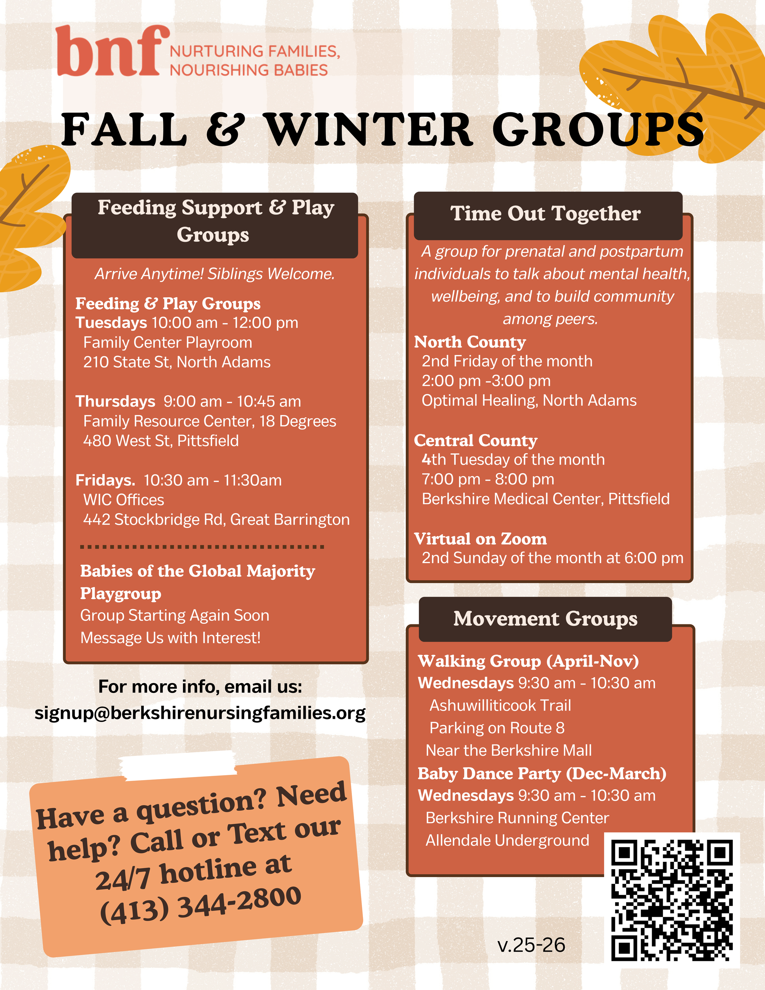 Current Groups All families welcome! All siblings welcome!Come meet other families, get support, build community, and check your baby’s weight! Not nursing? No problem! All types of feeding are welcome.Questions? Text/Call (413) 344-2800